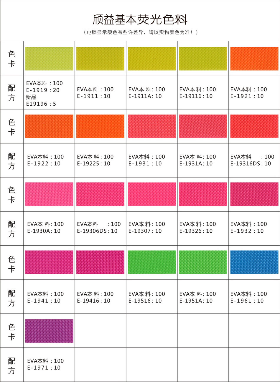 本型目录所提供EVA萤光色料(EVA-FLUORESCENT COLORS)均为适用之标准颜色。若有特殊颜色或物性之要求,我厂之技术部门将竭诚为您提供配色服务,欢迎洽询。